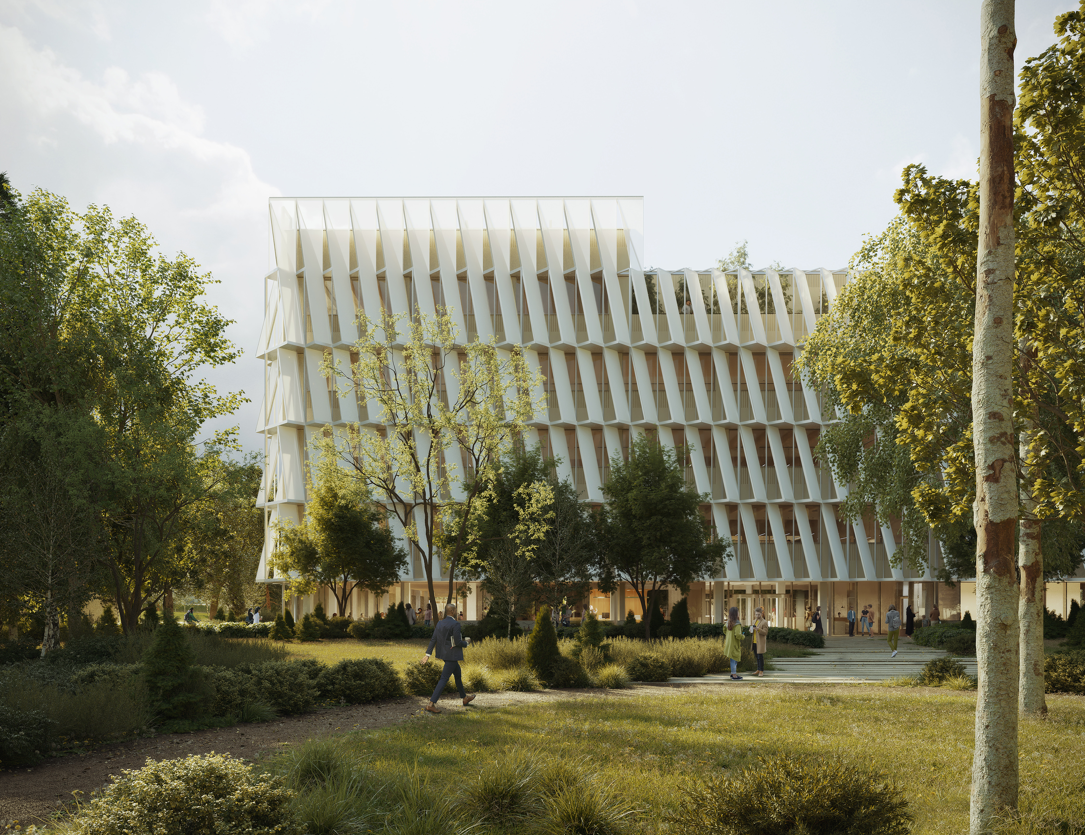 The first of the buildings to be developed in the Harwell Innovation Quarter site: Two timber-clad wings provide efficient and flexible lab spaces for startups to more mature organisations. A shared link provides the social gel for the two: pitch spaces, break out spaces, co-working spaces. Existing trees are protected. The new facility is nestled into new parkland and gardens.