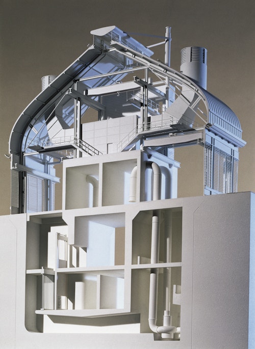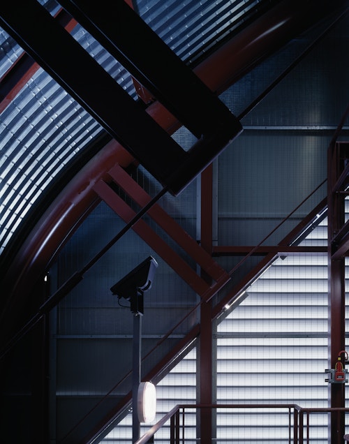 View all projectsAn addition to a Victorian sewerage and pumping complex in east London, this station raises the level of incoming sewage by 12 metres so that it continues its route eastwards out of the city. Operational requirements determine the linear and symmetrical nature of the building, which straddles the direction of the sewage flow. Above ground, the steel structure encloses a soaring space housing mechanical and electrical equipment with full access to pumping chambers deep below ground. If Bazalgette’s original pumping station is the ‘Cathedral to Sewage’, then this zinc-coated aluminium clad building stands fittingly like a shining temple alongside.