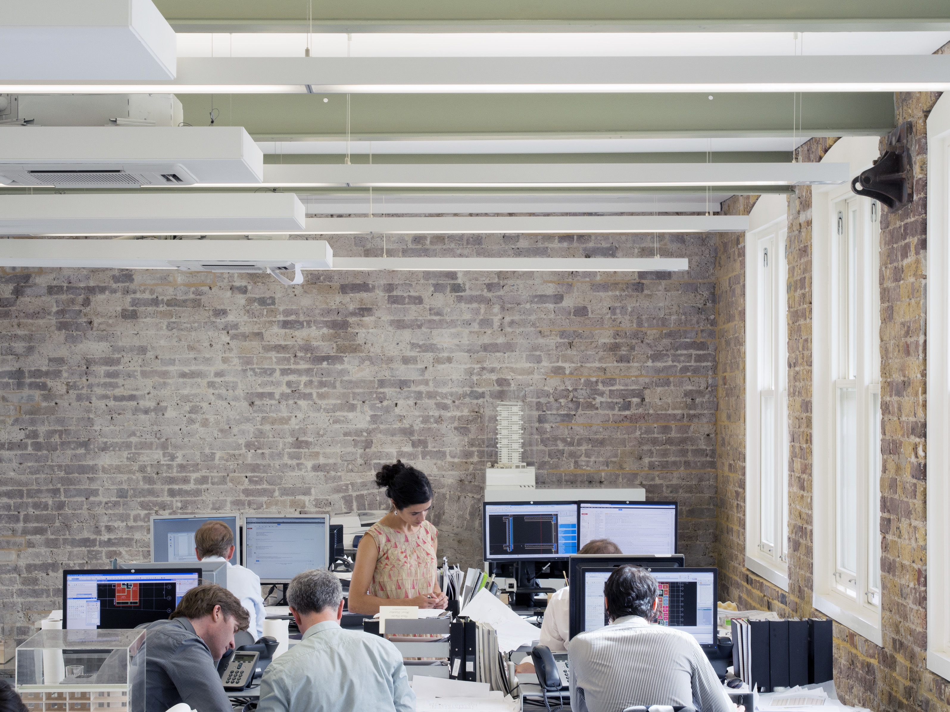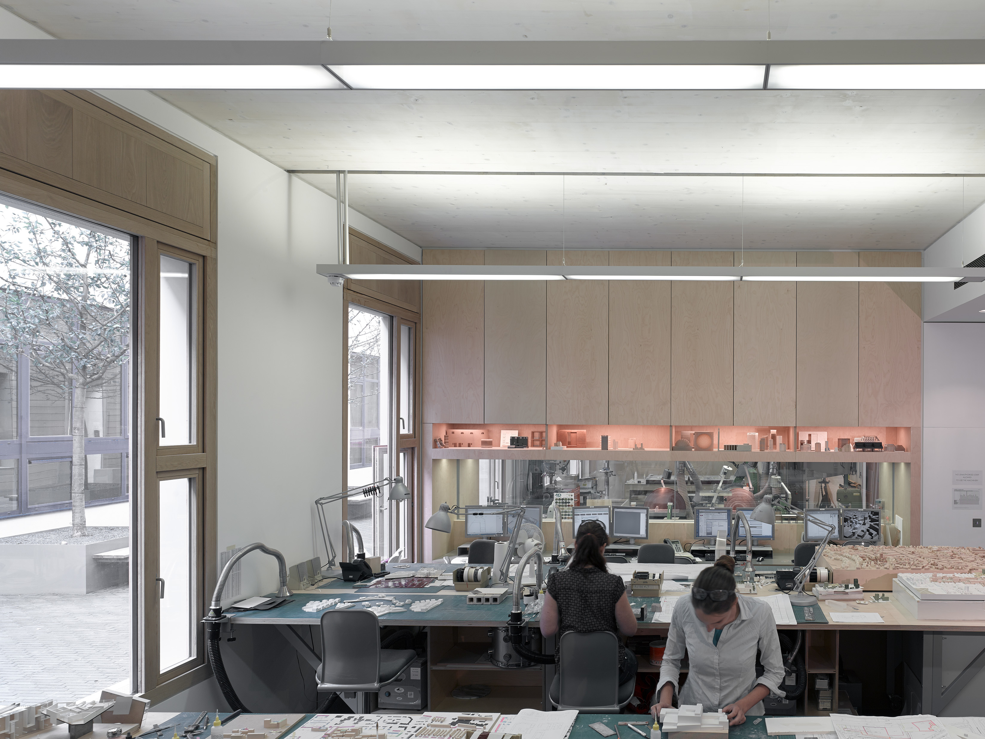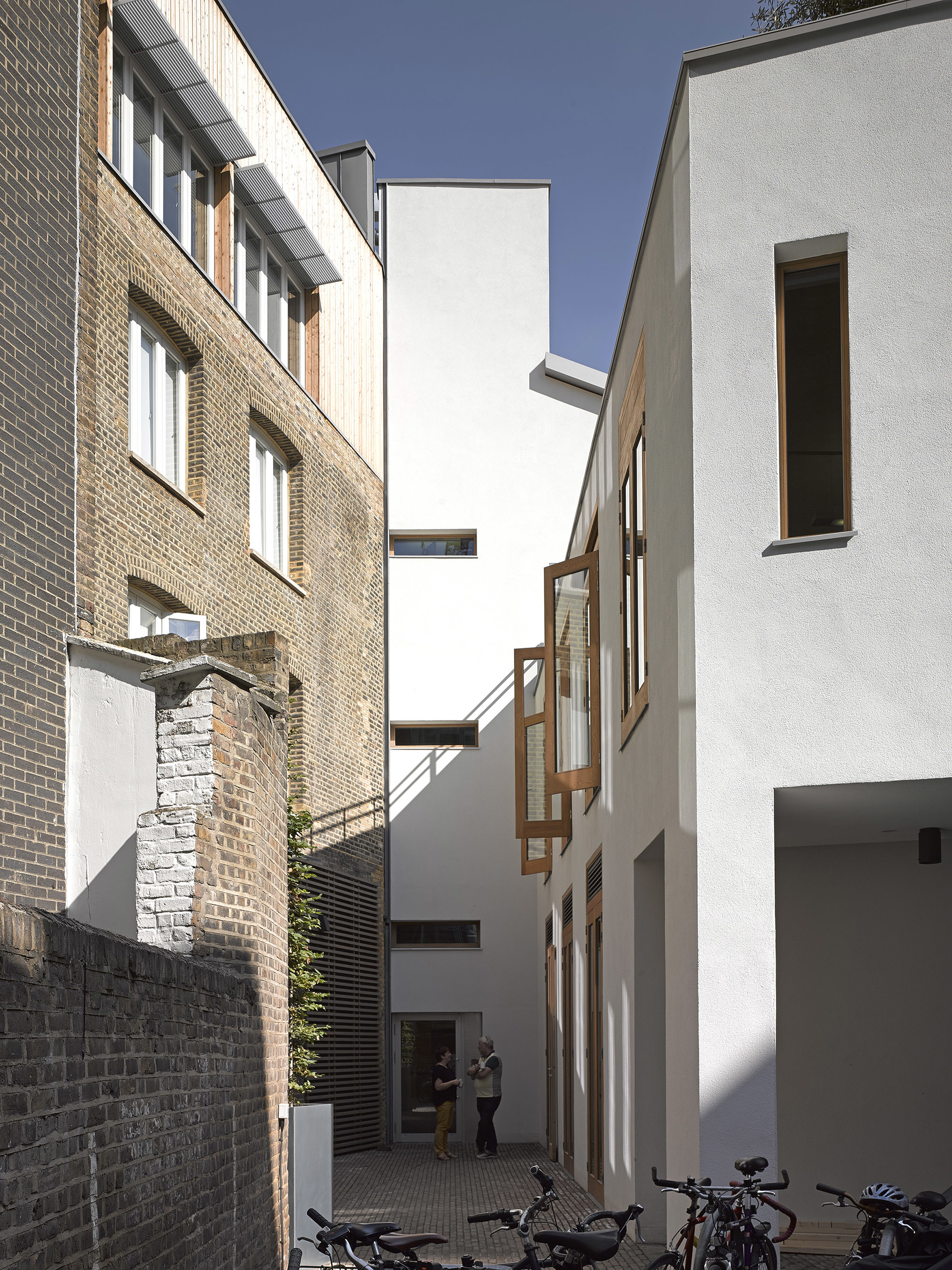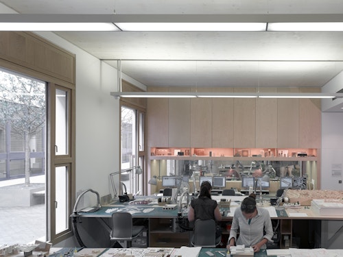 The warehouse has been sensitively restored, retaining its industrial character and celebrating its riveted steel frame and original brickwork which has been exposed throughout. A new pitched roof replaces a post-war insertion and extends the third floor upwards creating a light-filled office space. The Farnham Place extension meanwhile is constructed in cross-laminated (CLT) and has a timber clad exterior that references the timber workshops that were common in this area in the eighteenth century. Appropriately, it houses the practice's modlelshop on the ground floor.