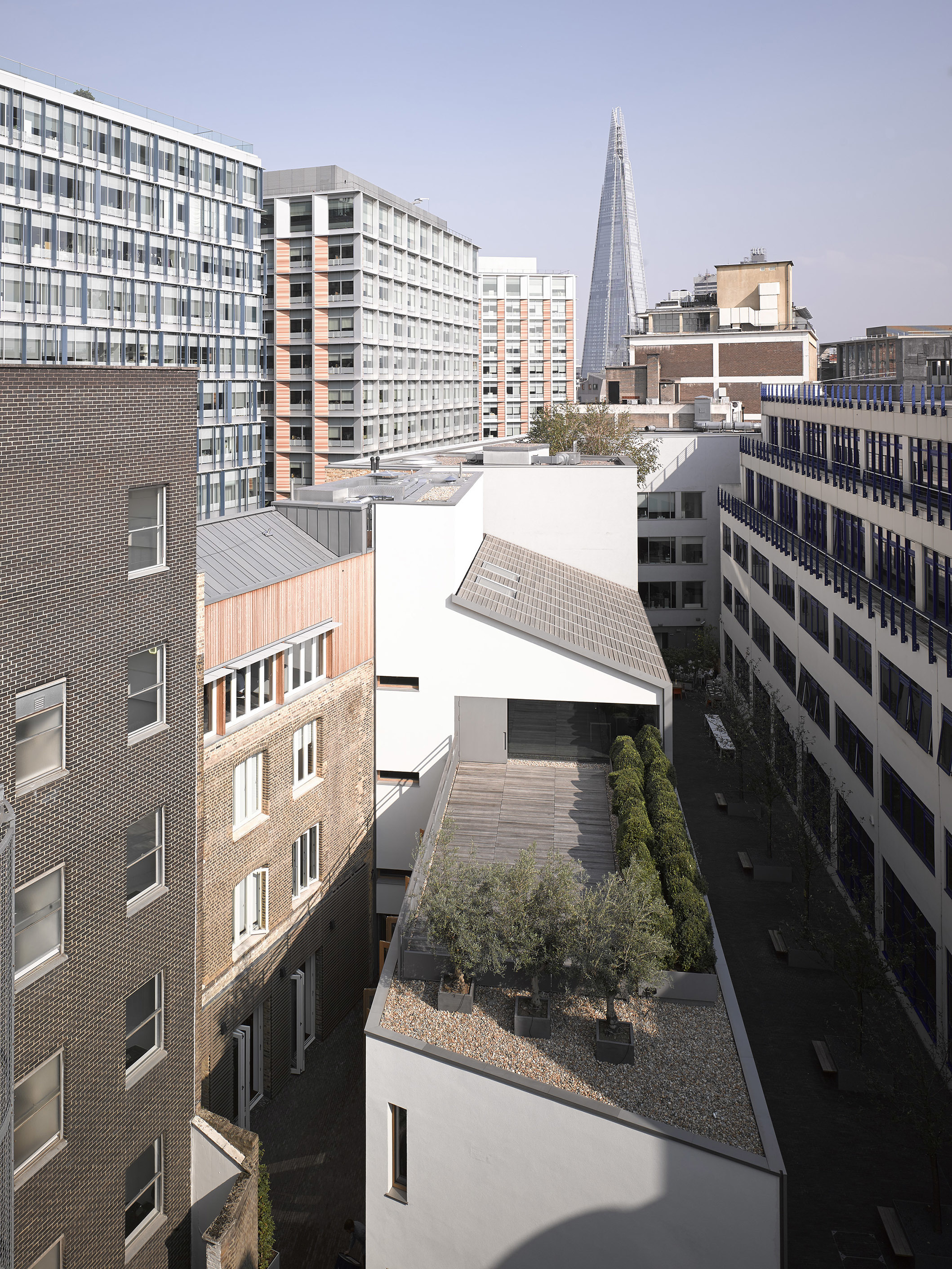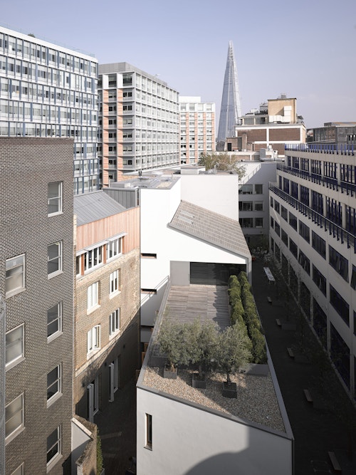 The new building for the practice was required to accommodate workspace for 150 people with additional space for meeting rooms, a model workshop, library and printing. The unusual shape of the site derives from the way Southwark Street, a Victorian addition and busy main road, cuts through the medieval street pattern, leaving a remnant of Farnham Place that defines the site's southern edge.