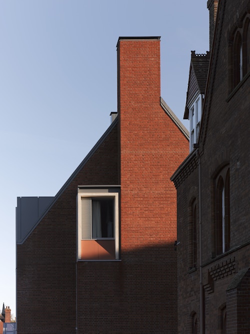 Placing the long wing of bedroom accommodation to the north-east side enables all the bedrooms to enjoy good morning light while minimising afternoon heat gain, and to exploit the exceptional quality of the views towards a pond and gardens to the east. The garden elevation presents a single, uninterrupted red brick facade, with deep set bedroom windows grouped together to form tall oriels that break through the line of the roof as dormers. The elevation facing into Ash Court is less formal and is punctuated by two projecting bays accommodating the shared kitchens (two per floor), two staircases and a lift.