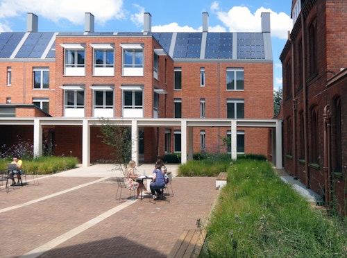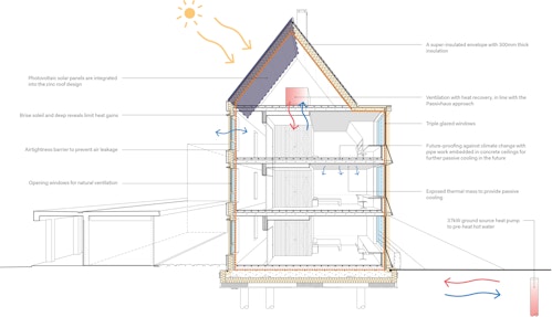 To meet the College's ambitious environmental targets, we took a Passivhaus approach, maximising the energy performance of the building and employing simple, robust strategies such as substantial insulation, to yield extremely low levels of energy consumption. Proportionate and sensible heating controls allow user control for comfort while minimising energy loss. Students can open windows for purge ventilation, but by automatically disabling the heating once the are quality reaches satisfactory levels they are also incentivised to close them. Exemplary fabric performance standards were met, resulting in an airtight building. U-values surpass regulatory requirements. In addition, in response to local planning policy requirement for on-site renewables, a 190 sqm photovoltaic array has been carefully incorporated into the pitched roof, providing nearly half of the building's demand for electricity.
