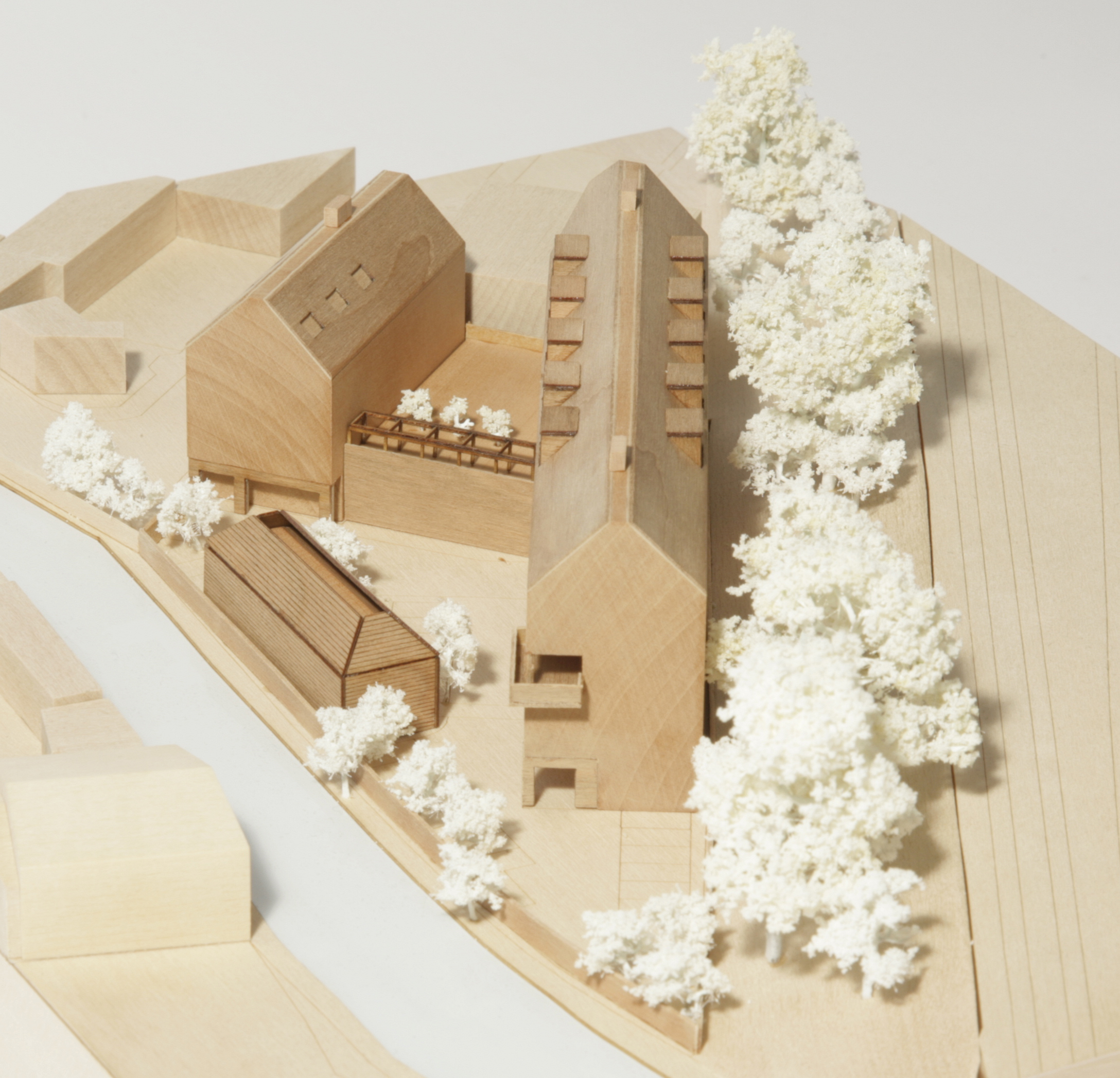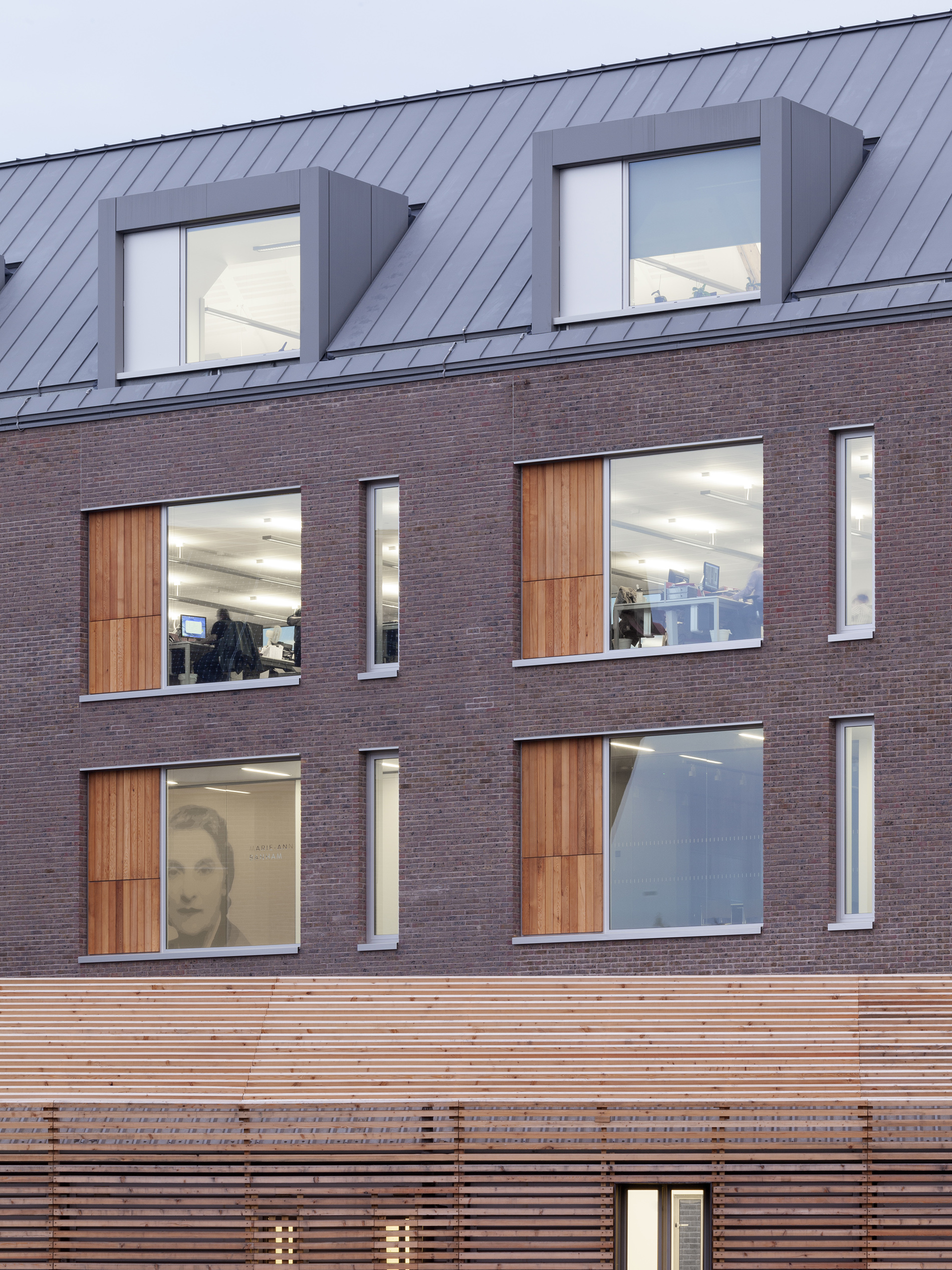 A simple palette of good quality materials was selected to suit the surroundings. The external envelope is brick, windows are anodised aluminium with openable vents clad in western red cedar. The shape of the gable ends is expressed and the roofs are finished in standing seam zinc with dormer cheeks in aluminium.