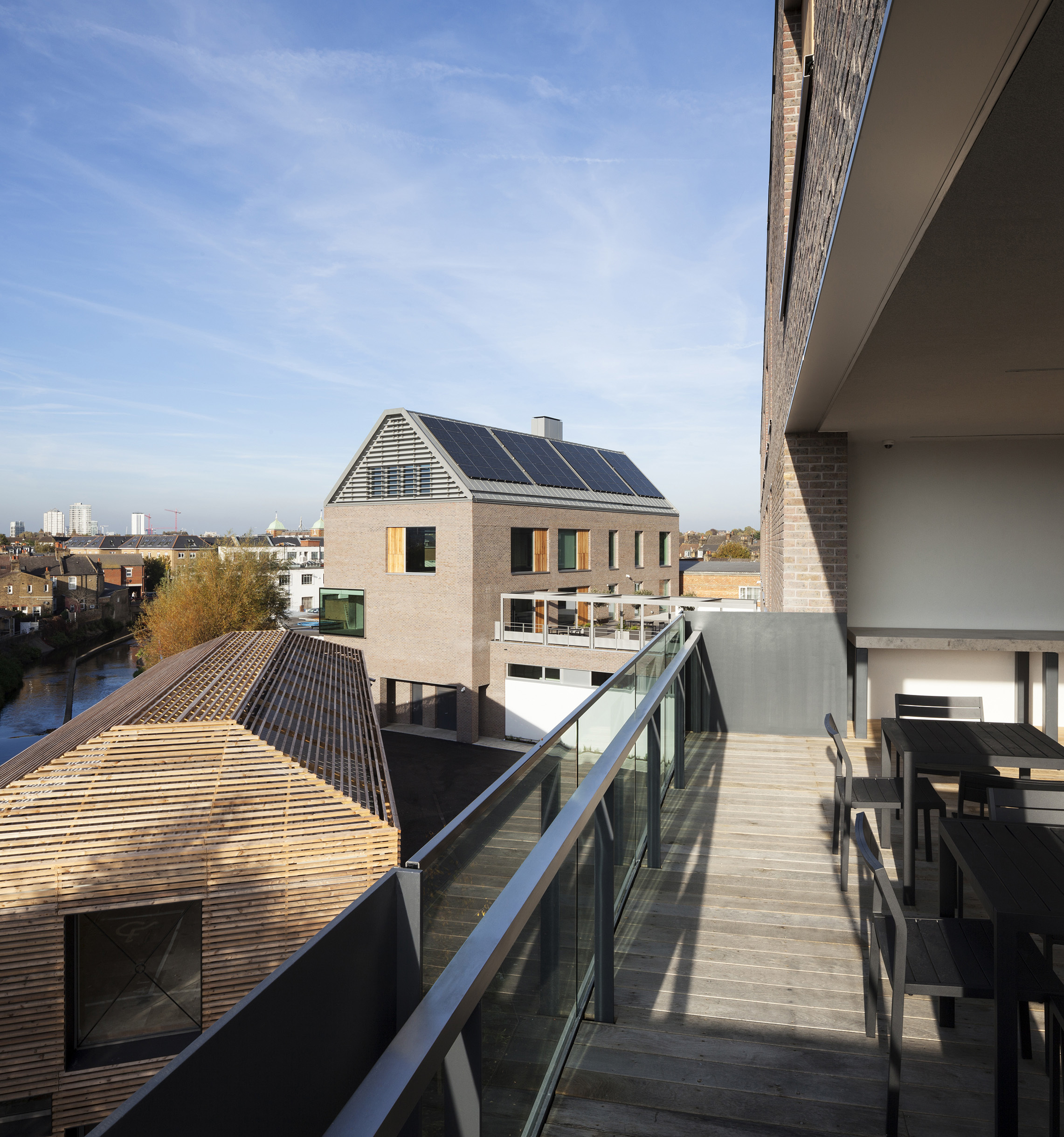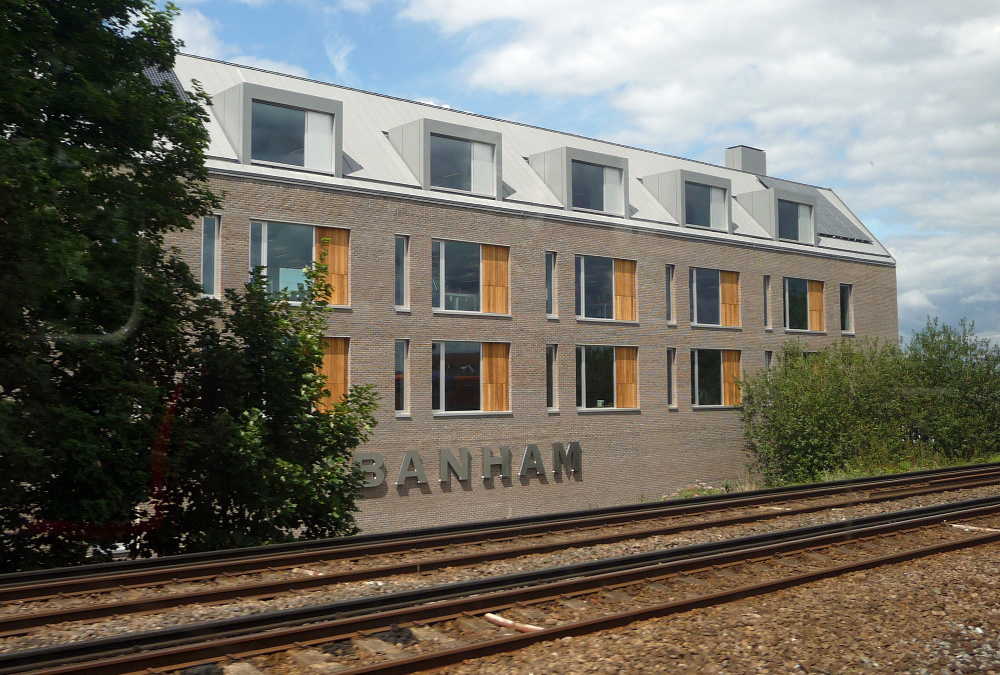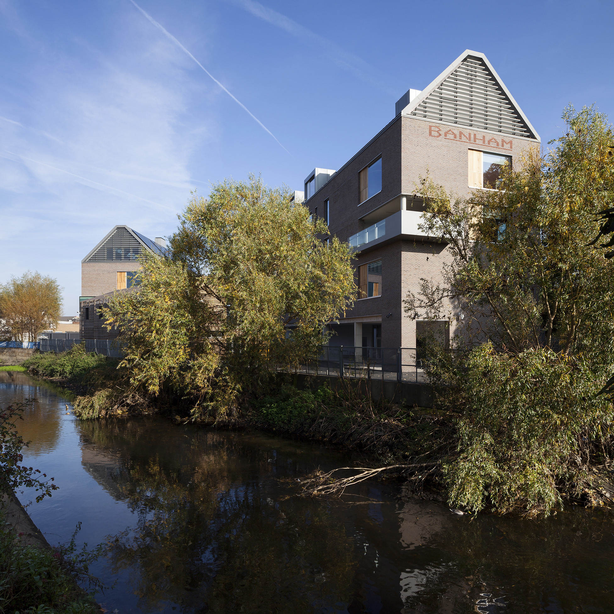 Banham identified a new site for its headquarters at Thornsett Road: a small industrial estate enclave with the River Wandle on one site and mainline railway tracks on the other, in the largely residential district of Earlsfield, south London. The new development involved the demolition and replacement of an existing industrial building and the retention and refurbishment of a stand-alone pavilion. The largely residential location necessitated an architectural response that was sensitive to its surroundings.