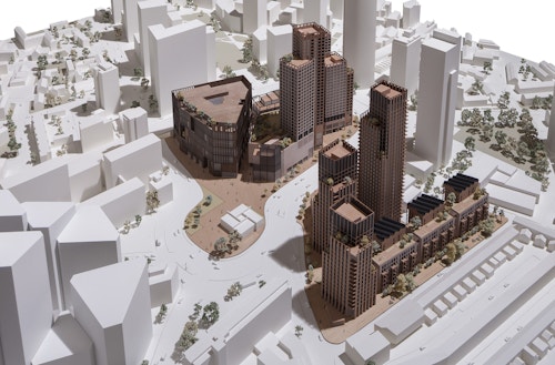 The first big move is to move LCC across the street to replace the shopping centre. Built over the Northern line entrance, a new twelve story signature building will incorporate all the functions of LCC as well as additional accommodations for the administrative offices of University of the Arts London (UAL) of which LCC is a constituent college. The first three levels will be publicly accessible, offering a place for students and society to meet in a mixed space incorporating retail and food vendors. A series of four storey voids up and down the building allow for engaging and flexible layouts to suit LCC's evolving curriculum. The UAL:LCC building is nestled in a group of three residential towers varying in height from 21-32 storeys, 2-3 levels of street-facing retail and a 4-storey retail pavilion. The western site responds to a very different condition: three residential towers, 20-35 storeys in height, are clustered alongside a terrace of mid-level homes responsive to the more domestic scale of the site's western edge.