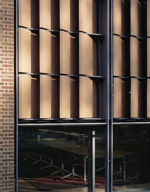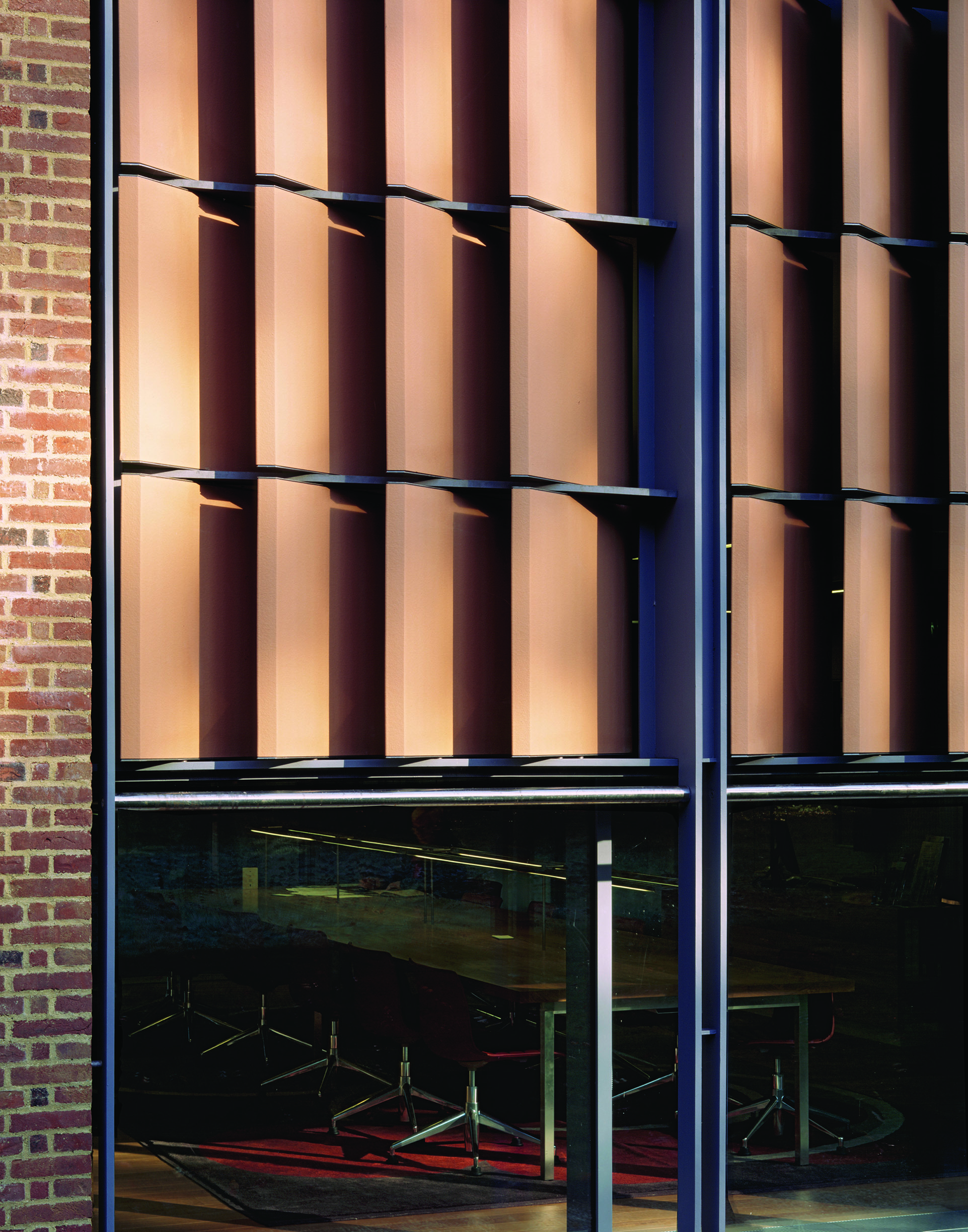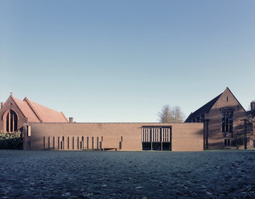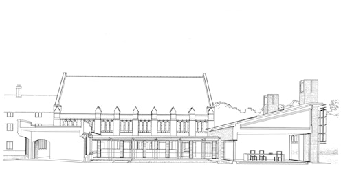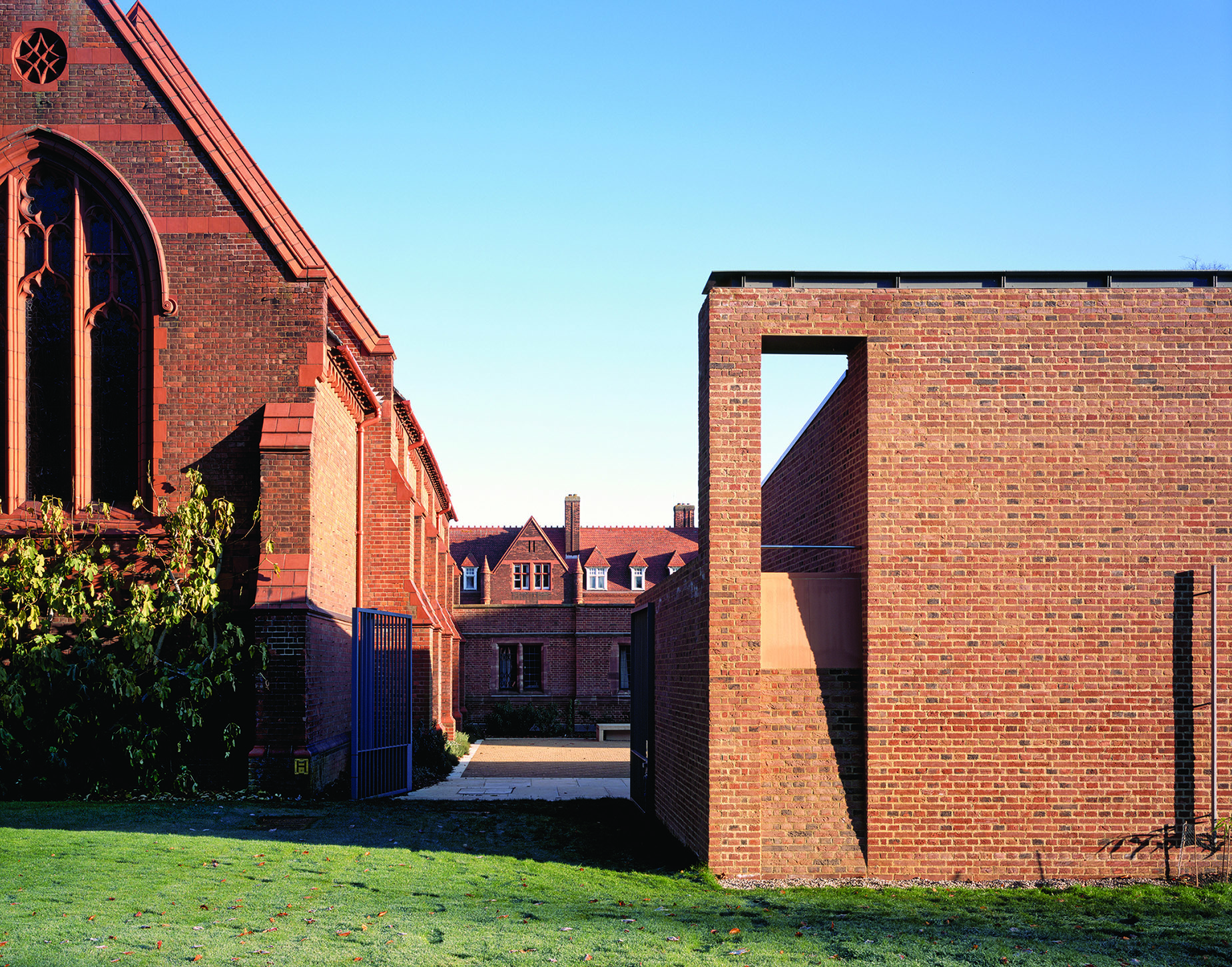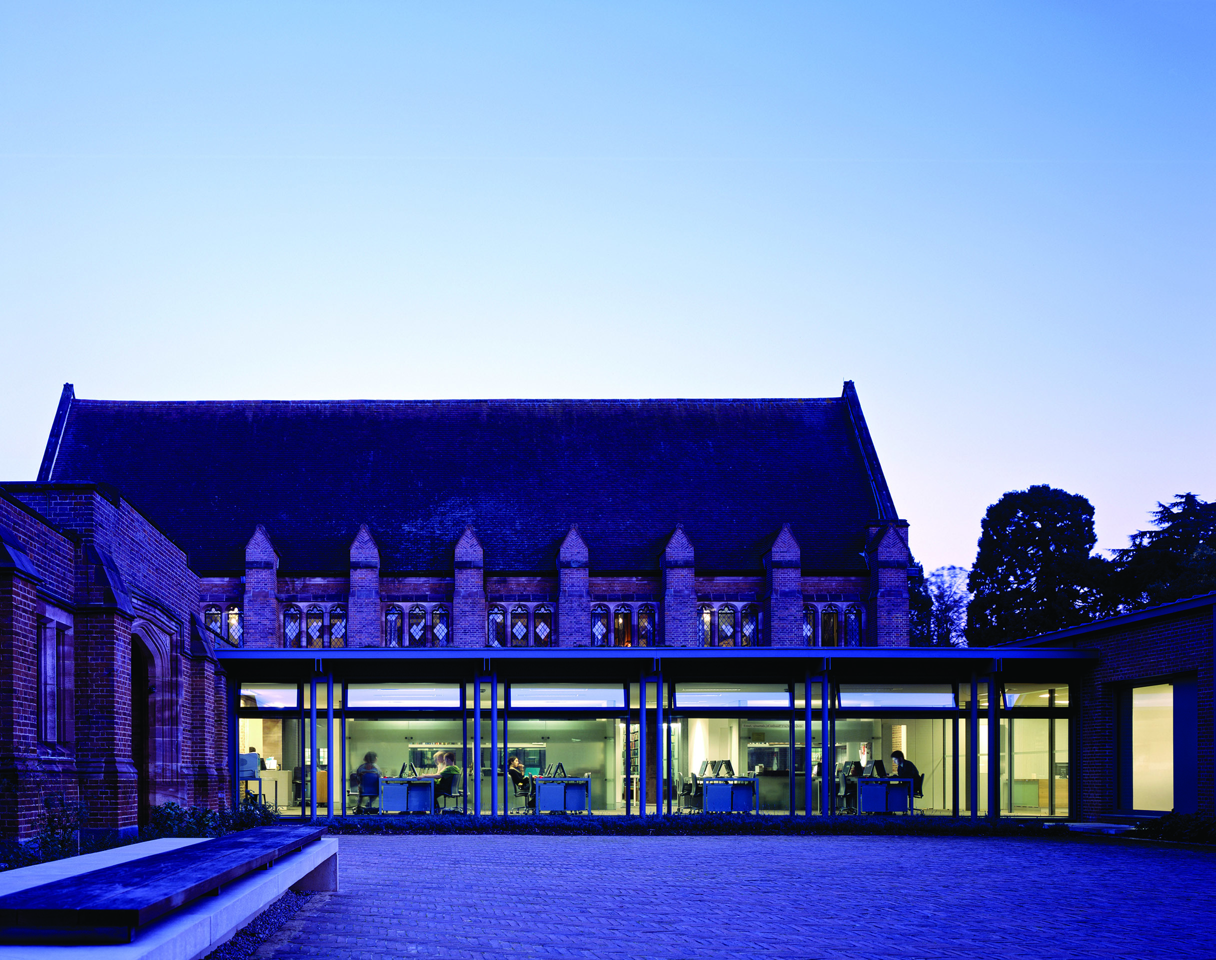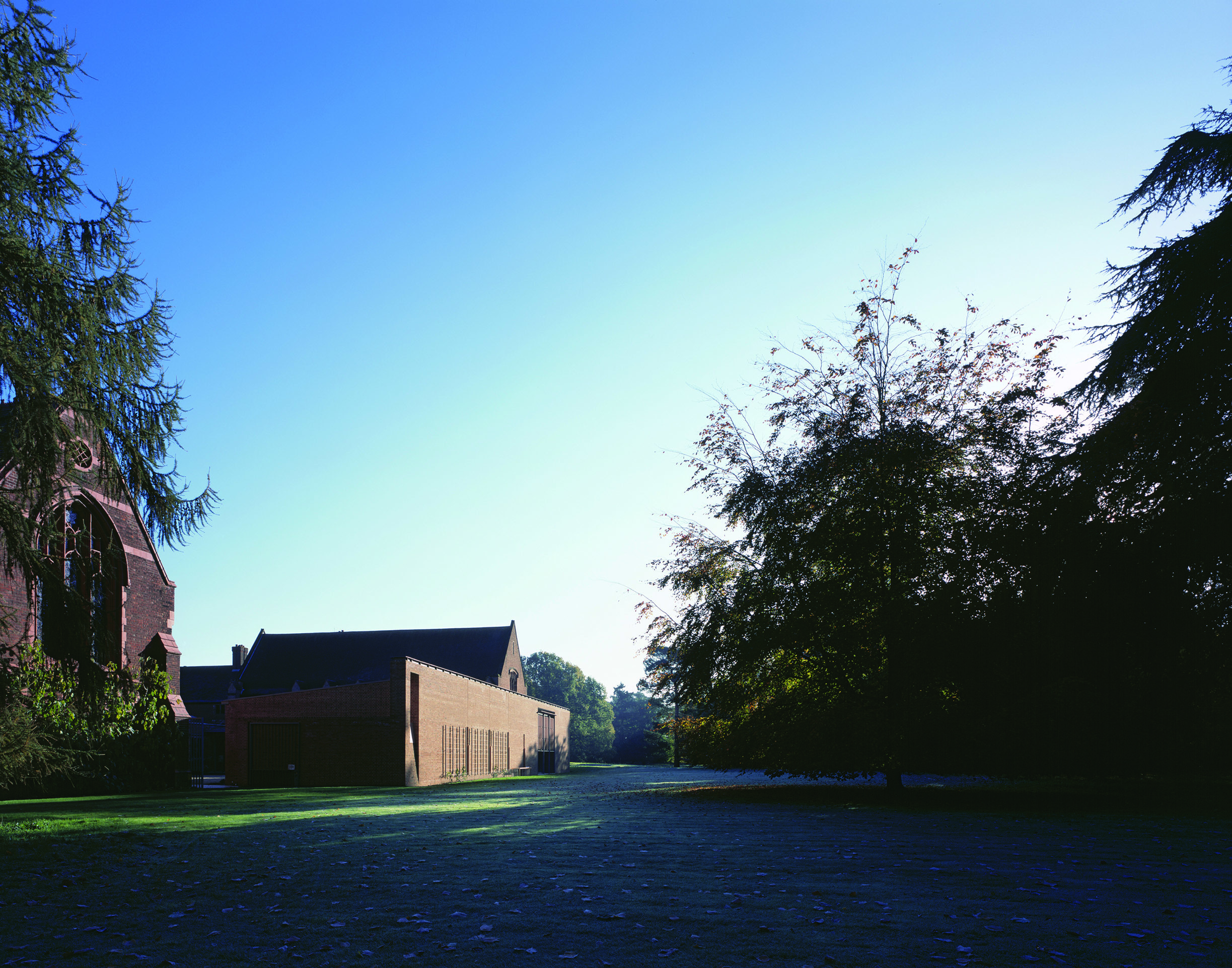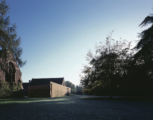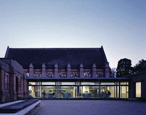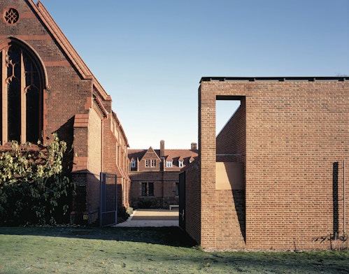 View all projectsBuilt to house the College's growing collection of women's papers and rare books, the Girton Library and Archive is designed to achieve the highest levels of environmental stability with minimum energy use. Set between the original library and chapel, the building projects out into the landscape to create a new courtyard space which extends the College's existing sequence of linked courts. A highly insulated single-storey brick enclosing wall with a lead monopitch roof houses the archive and special collections store, together with a reading room and archivists office. At ninety degrees to this, a second steel-framed glazed structure with a flat sedum-covered roof contains the library offices and IT suite and links to the main circulation within the College. The new entrance sets up a direct view into the reading room and through a large single opening to the gardens beyond. A screen of terracotta panels held within a metal frame provides protection from solar gain.