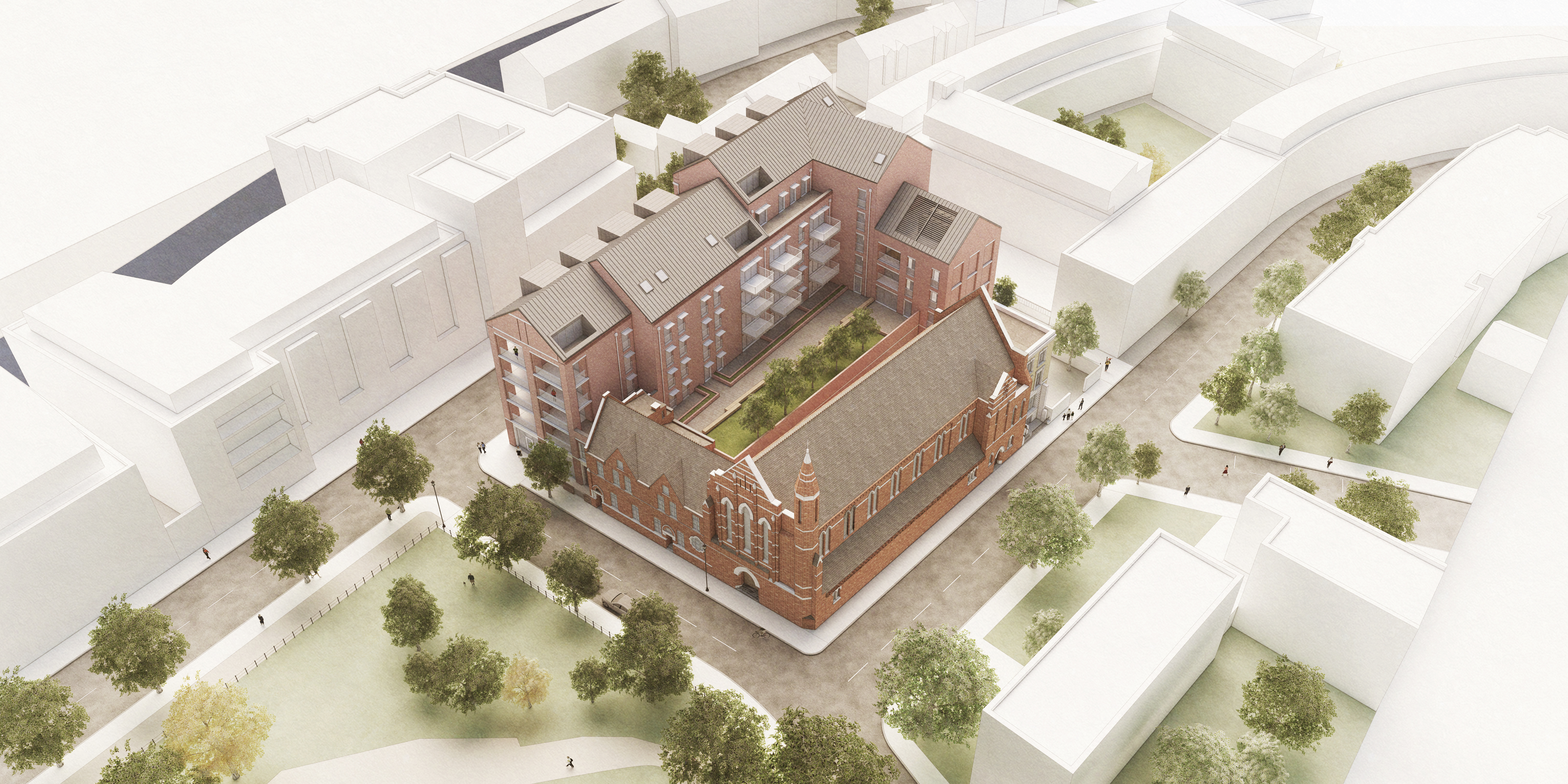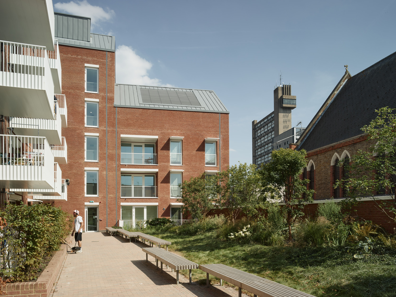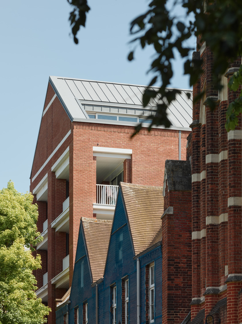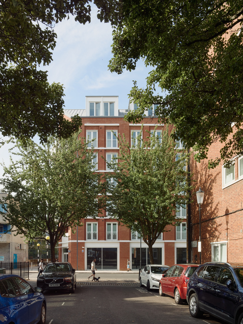 View all projectsNew affordable homes, a community centre and a shop combine to form an L shaped building that tucks around a courtyard garden, screening it from busy Kensal Road. Echoing the pitched roofs, material palette, and detailing of Our Lady of the Holy Souls, the Grade ll listed Victorian church on one side of the site, the new building employs dormers and balconies to punctuate and enliven the facade and uses the roof space, set-backs and stepped building heights to create generous, varied apartment layouts.