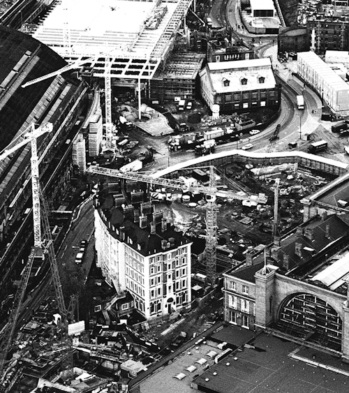 With the decline of freight by rail and London's transition to a post-industrial economy, the area had fallen into decline by the late twentieth century. The first attempt at a comprehensive redevelopment, with a plan drawn up by Foster + Partners, had to be shelved due to the recession of the early 1990s. By 2000, developers Argent - on the back of the successful delivery of Brindley Place Birmingham - took on the role of developing the land between and directly north of the two train stations. This would subsidise the upgrade of St Pancras Station which was to be the new terminus of the Eurostar service from the continent. This is when we began to work drawing up a new masterplan with Poprhyrios Associates.