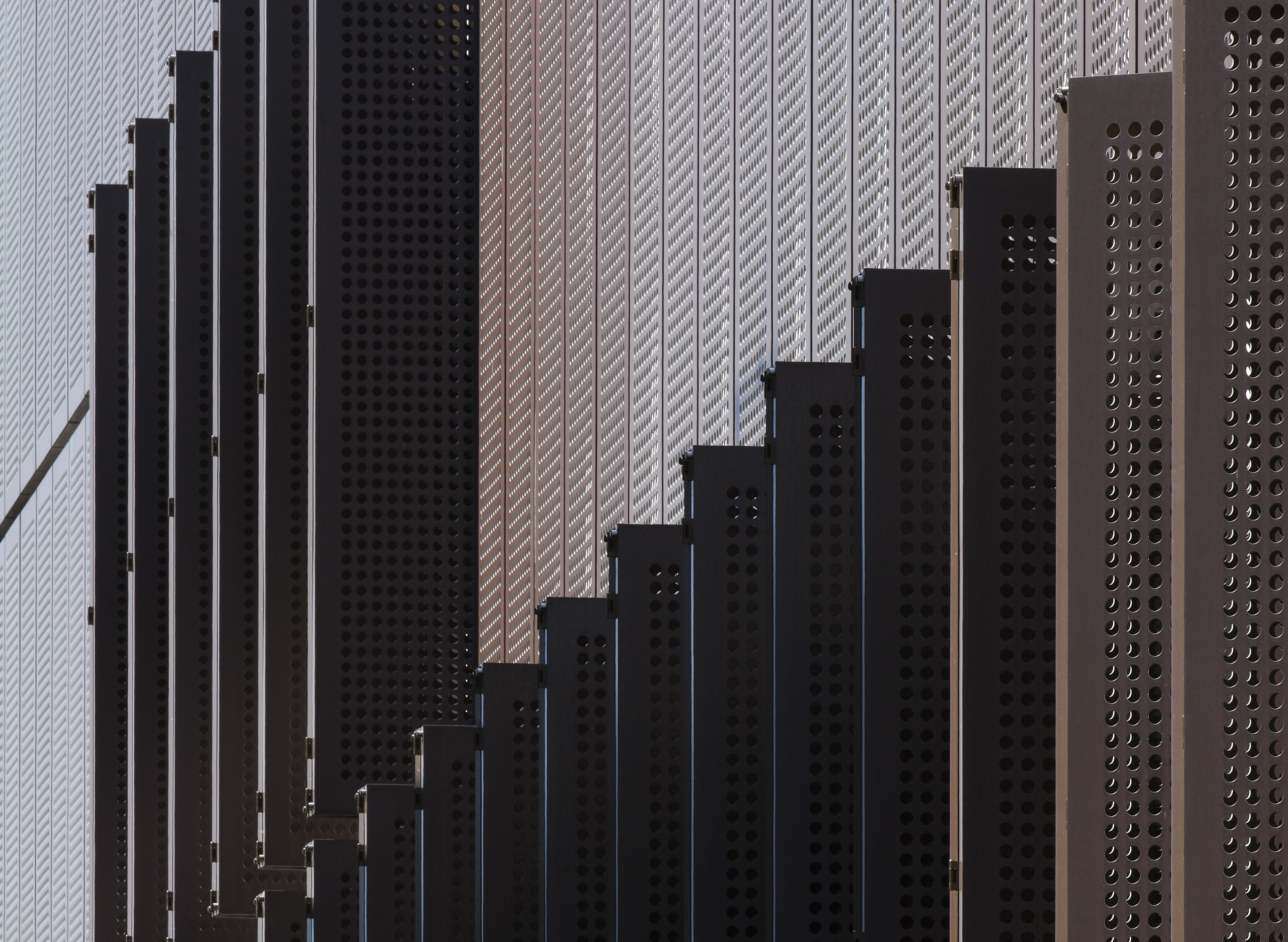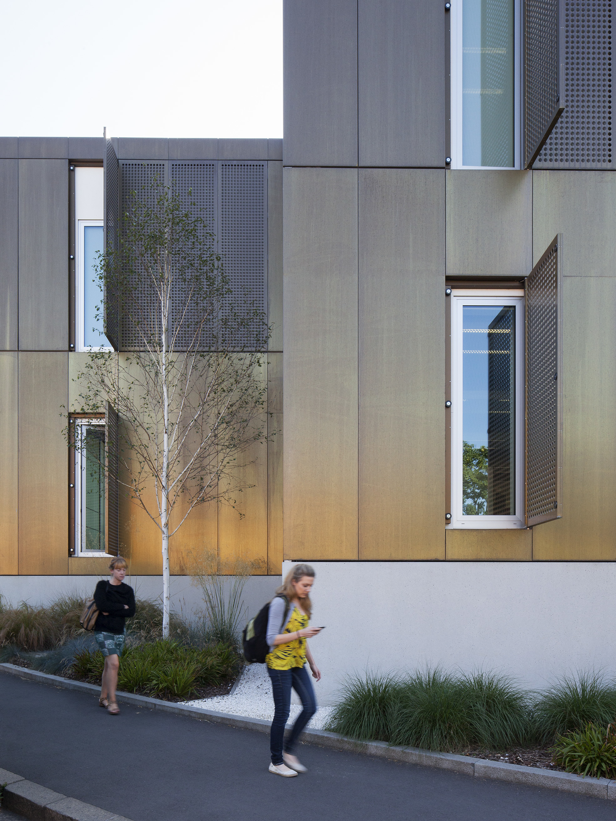 The internal plan is designed to facilitate cross-disciplinary working with labs and open-plan write up space on every floor. The laboratory spaces are enclosed by a perforated ‘veil’ of motorised brass panels so that solar gain and privacy are controlled independently by researchers, promoting an animated and responsive facade. The perforated metal veil extends to conceal the plant at roof level and gives a lightweight, translucent quality to the top of the building. An intermediate scaled block at the centre of the plan contains more heavily serviced laboratory spaces requiring a controlled environment and limited natural daylight.