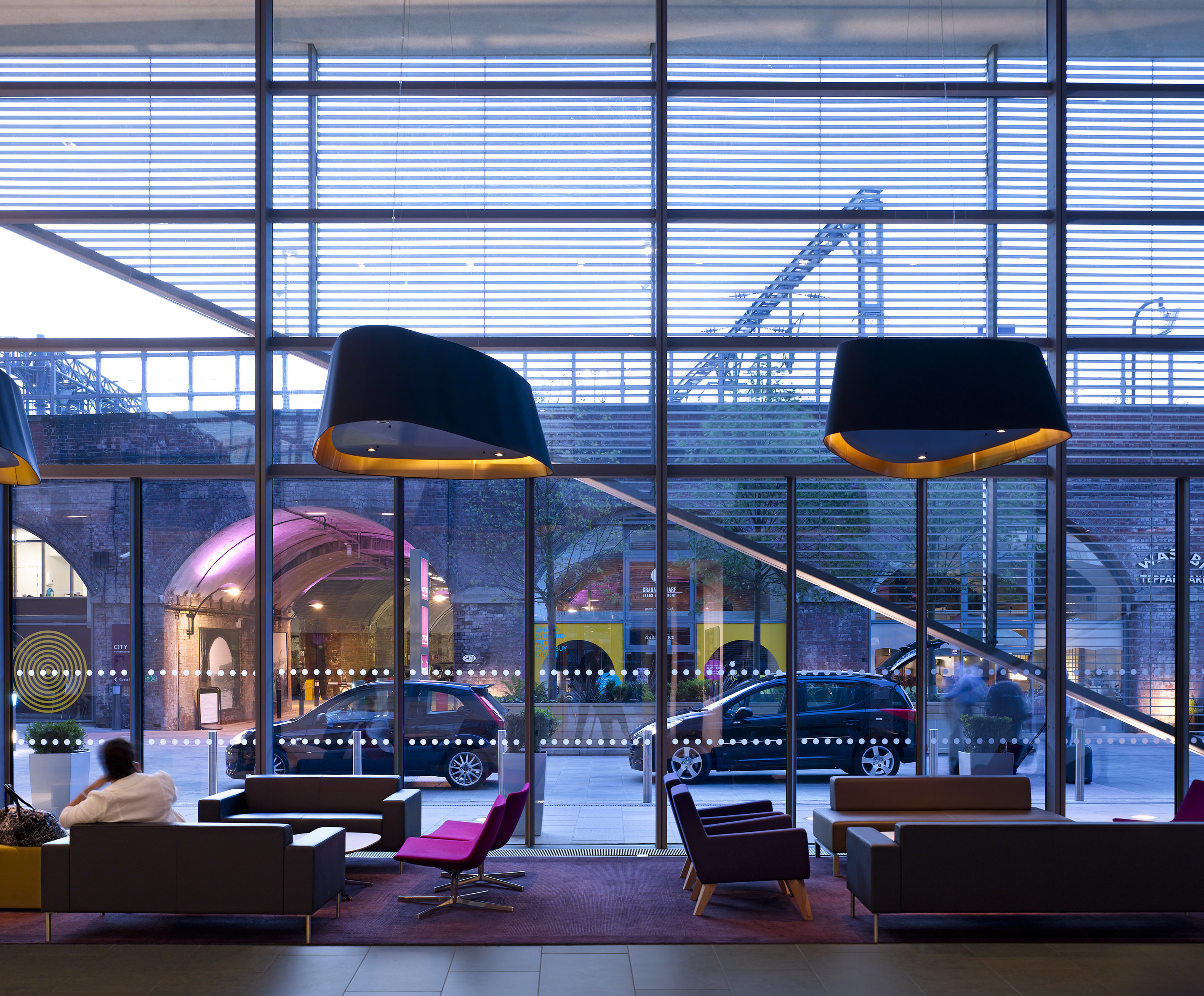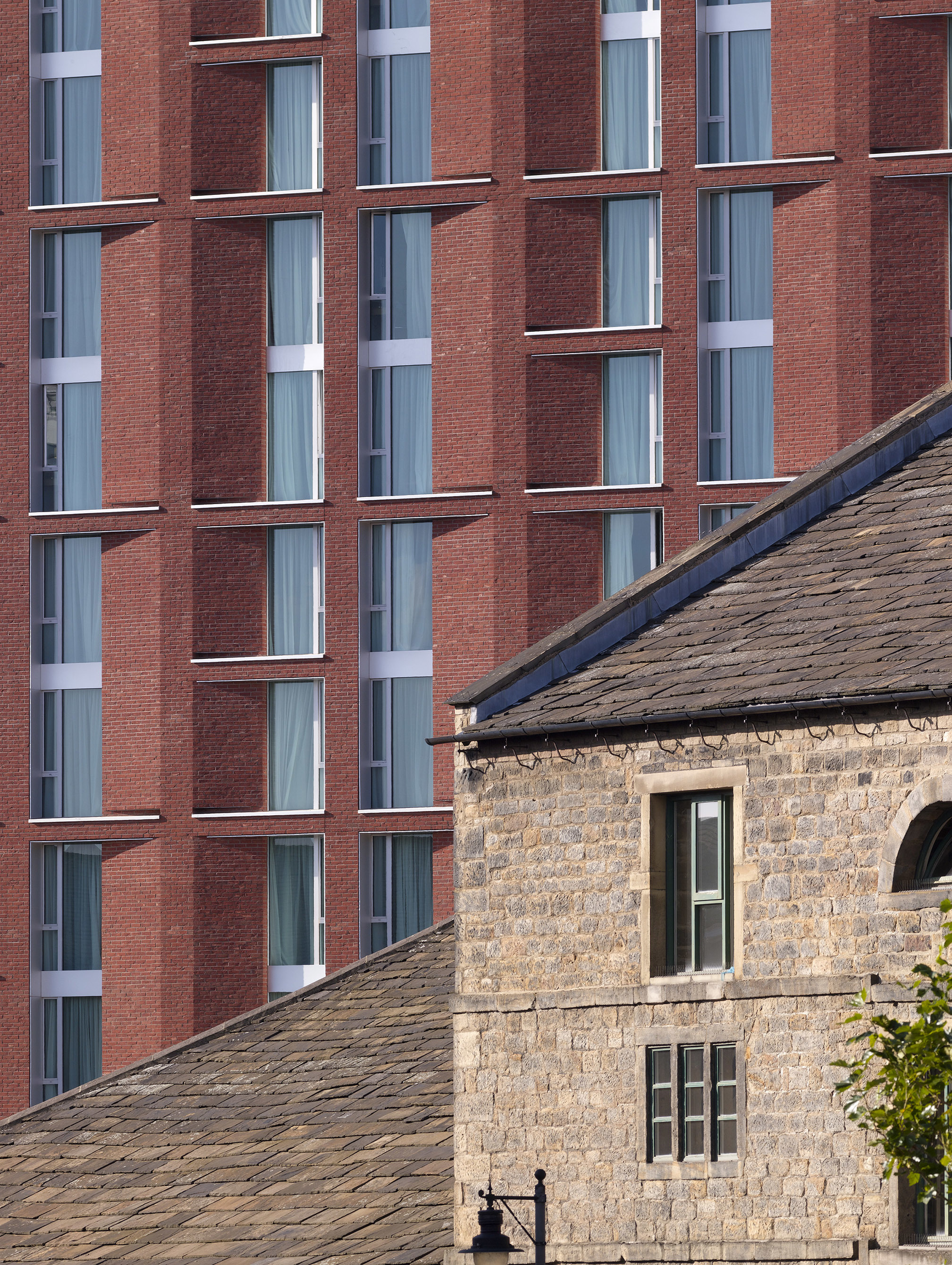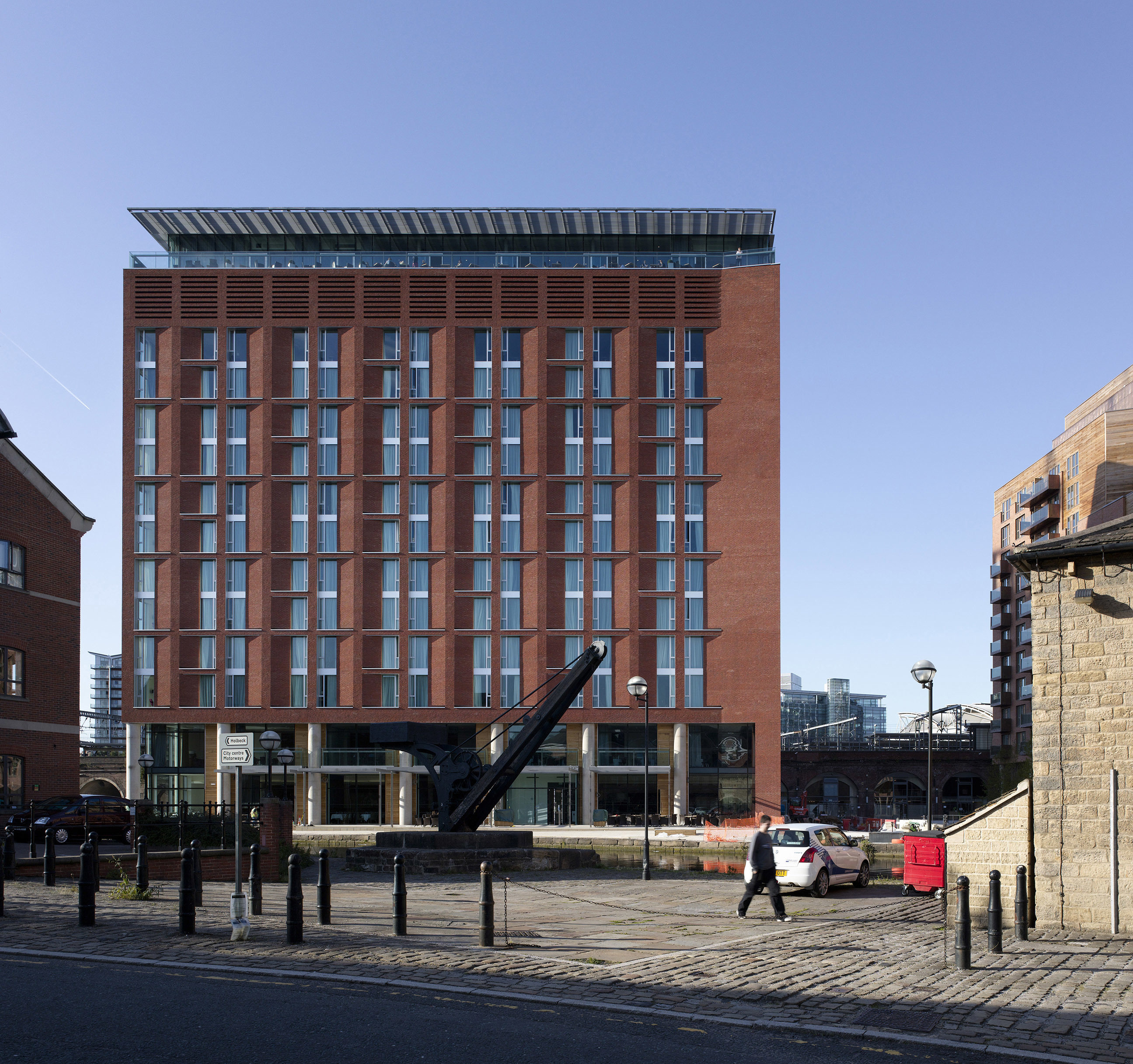 View all projectsSet between Leeds railway station, the River Aire and the Leeds and Liverpool Canal, this hotel provides 333 contemporary and affordable rooms plus conference, cafe and restaurant spaces. In response to the site's industrial heritage, the building is constructed in red brickwork with double-storey openings and deep, splayed window reveals providing shade and modelling to the facades. At the base, tall columns and glazing emphasise the relationship of ground floor spaces with the waterfront, while at the top a deep cornice shades the south-facing rooftop bar which provides views across the city.