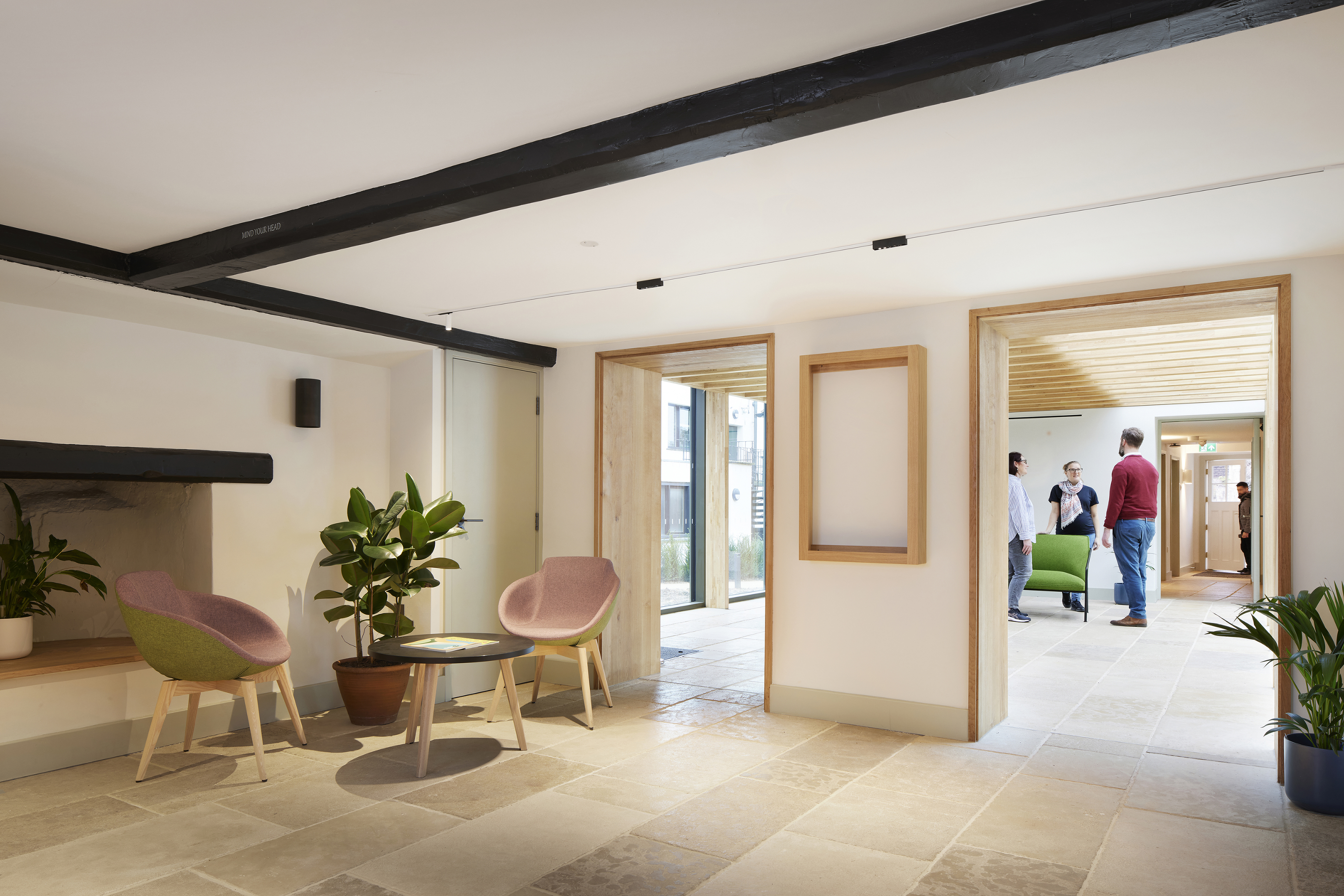 View all projectsA need to strengthen the College’s entrances had been identified as part of the masterplan we produced for St John’s College. A deep retrofit of two Grade II listed buildings, previously a restaurant and student accommodation, transforms them into a new Porters’ Lodge and high-quality office space for the College. The once-separate buildings are now connected through a new glazed link building, establishing a step-free connection between them. Additionally, a new courtyard has been introduced, not only giving access to daylight but also creating an amenity space at the heart of the scheme.