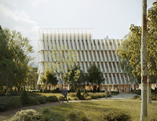 View all projectsEstablishing a sense of place within the landscape of Cambridge Science Park, Unit 440 will be a highly efficient lab-enabled building for Trinity College, Cambridge. Anchoring the western side of the park; its distinctive facade of fins provides solar shading with roof PV panels contributing to on site renewable energy provision. An internal courtyard garden sits at the heart of the building; visible from the flexible internal spaces, it looks out to the parkland setting beyond. As the city strengthens its presence as a hub for life sciences and innovation, Unit 440, having now received planning consent, offers a sensitive and adaptable solution in a uniquely Cambridge way.