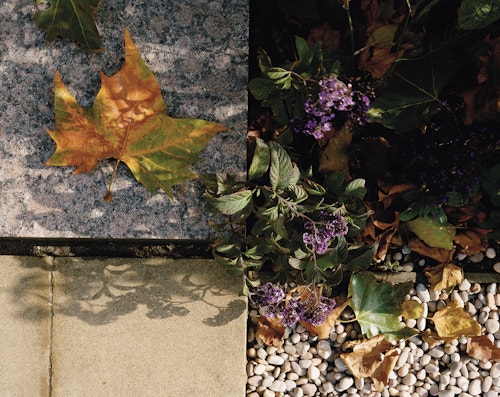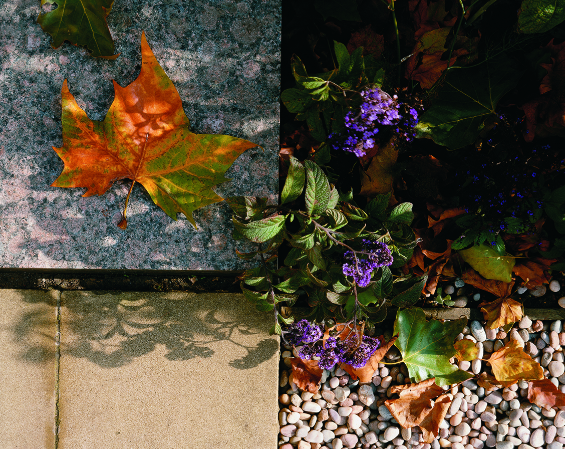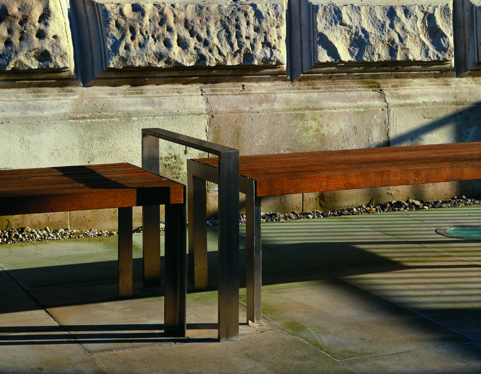 Extending either side of the main entrance are two wide flower beds, which provide a changing visual focus for the gardens. Their planting changes each season, designed by the landscape architect Brita von Schoenaich. The bed are conceived as a series of cuts into the ground, like the Atterbury Street entrance, and their geometry echoes that of the building.