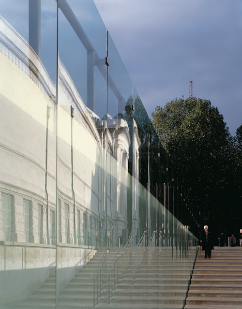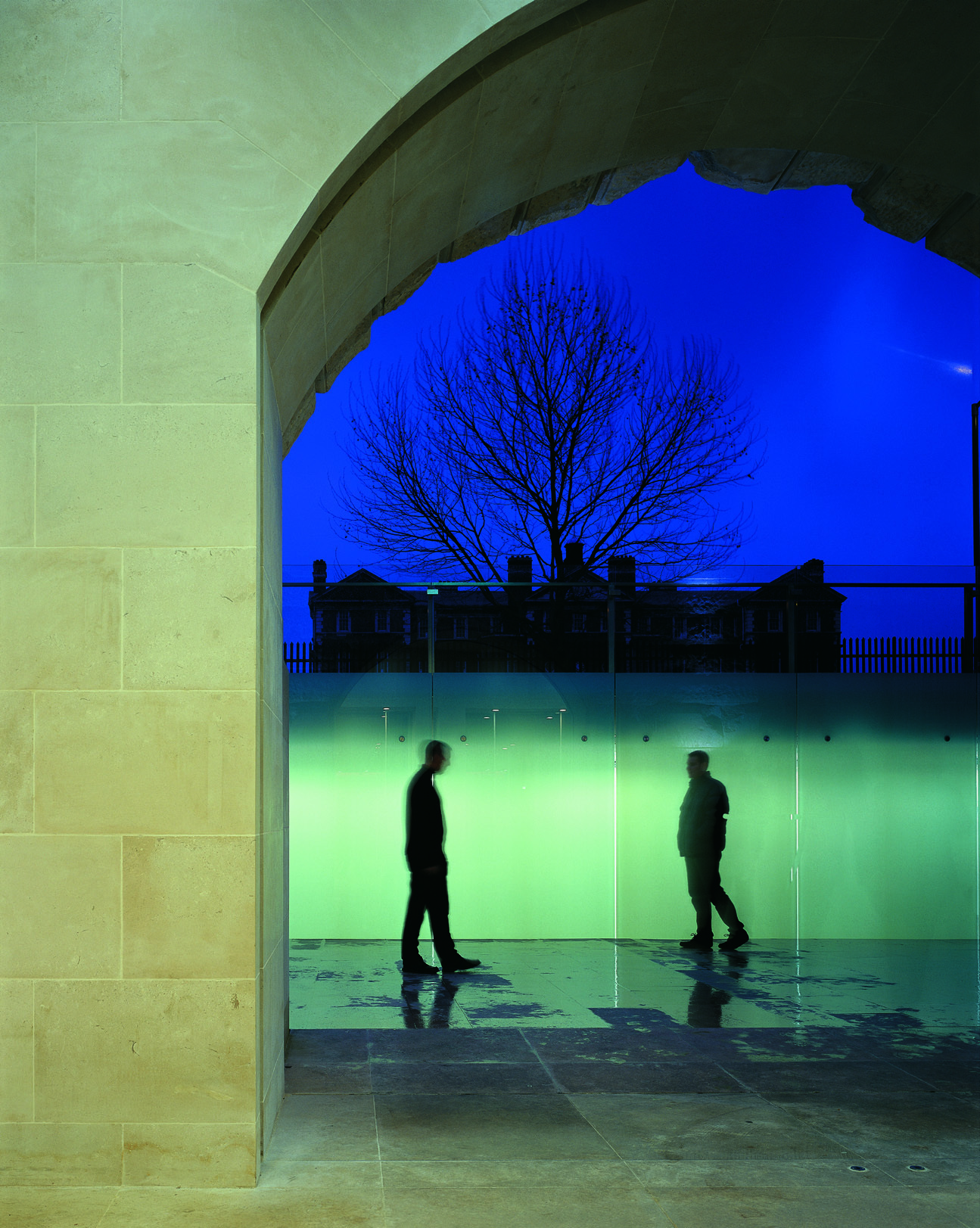 The entrance takes the form of a six-metre-wide incision in the ground, parallel to the existing stone facade, containing on one side a wide stone staircase and on the other, a ramp suitable for disabled visitors. The stair and ramp are contained by a continuous ribbon of glass, translucent below ground level, transparent above. By night, the glass wall is back lit and illuminates both stair and ramp, announcing the new entrance.