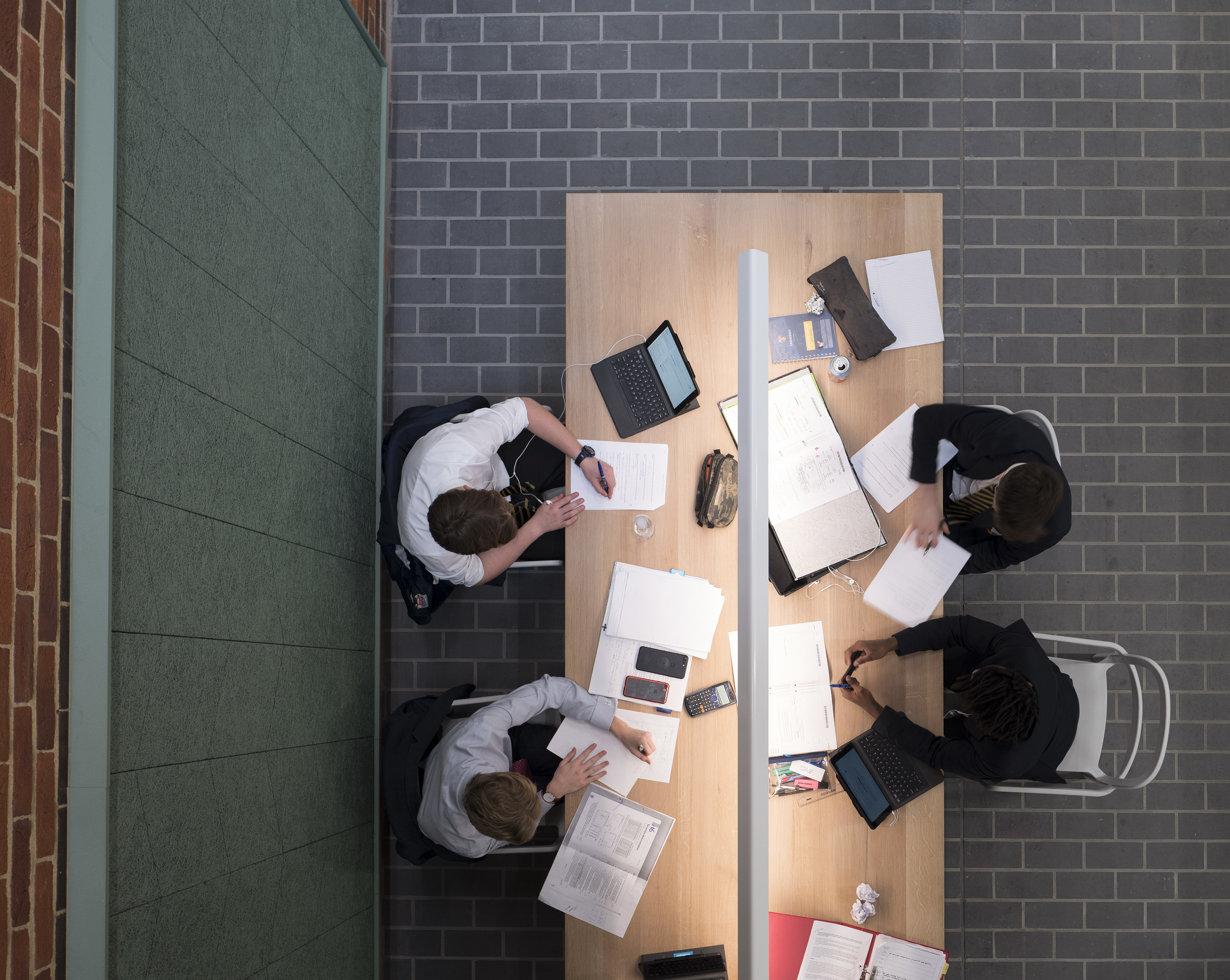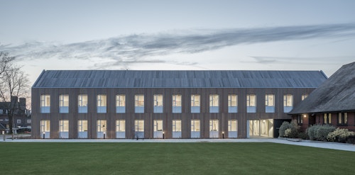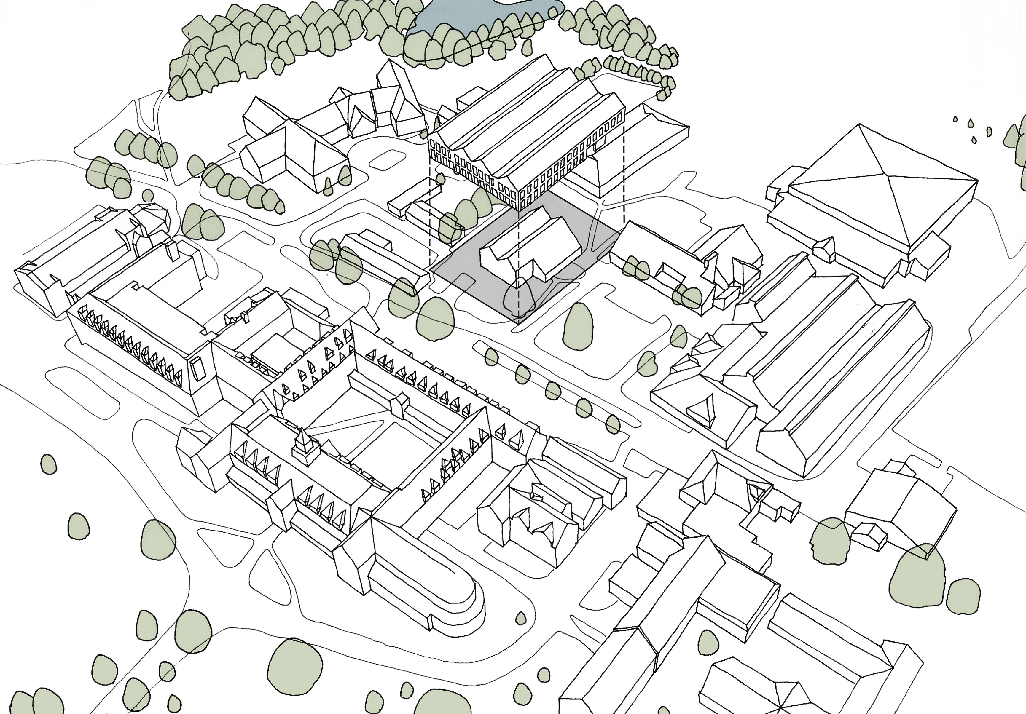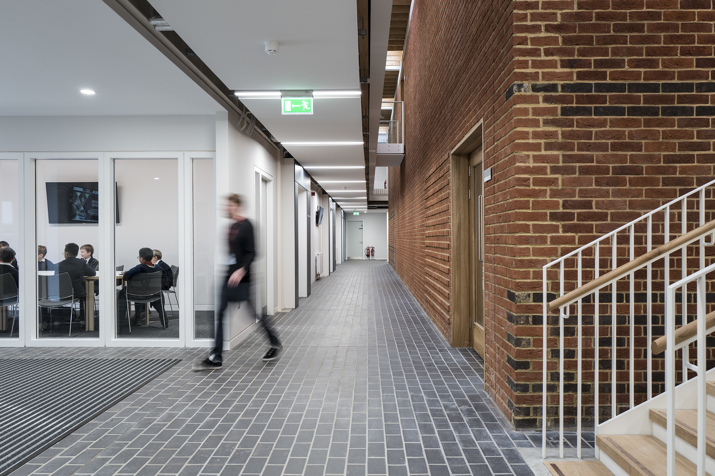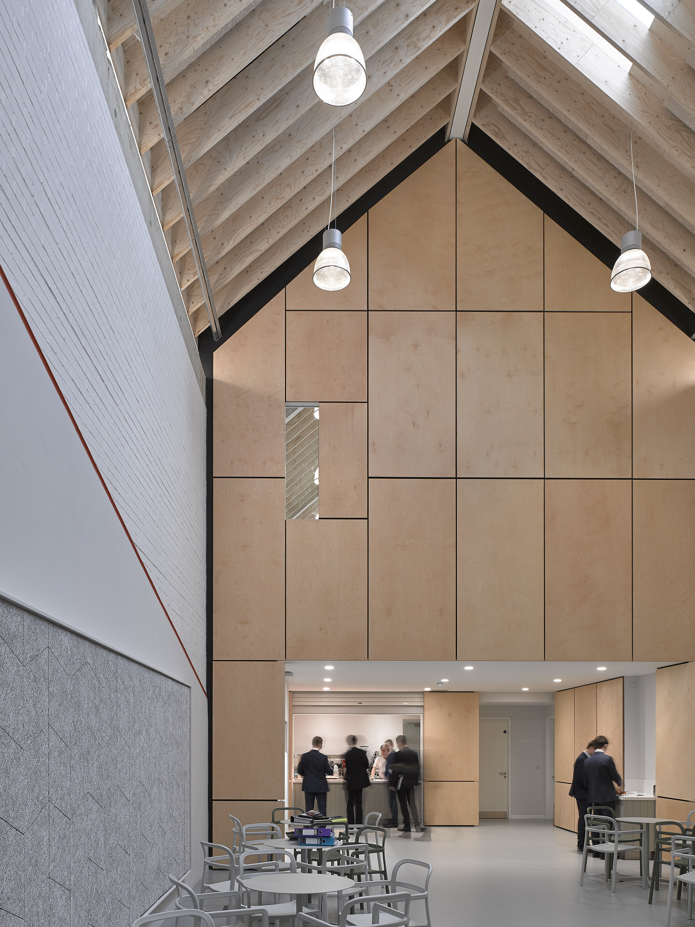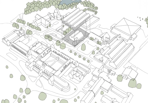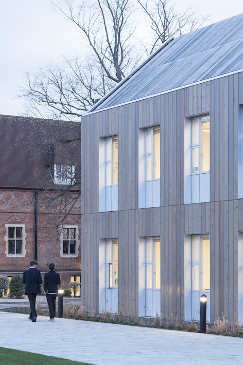 View all projectsLocated at the heart of Cranleigh School's historic campus, this project for a new teaching building and student social spaces extends a new timber and steel structure around four disused squash courts. New accommodation on two levels provides twenty-four classrooms for humanities and business studies, while the squash courts themselves have been remodelled as a double height cafe and social space at the centre of the building.