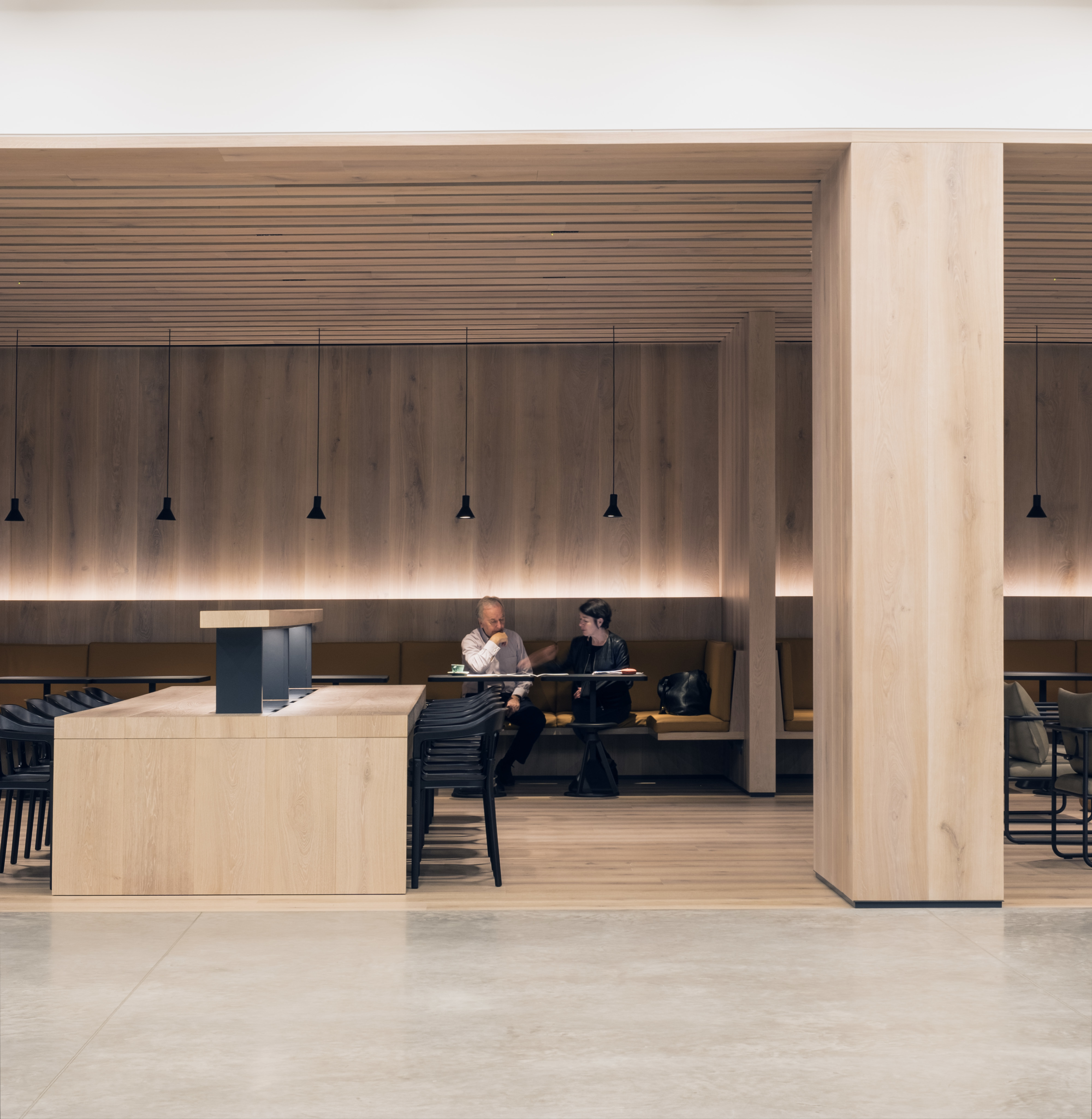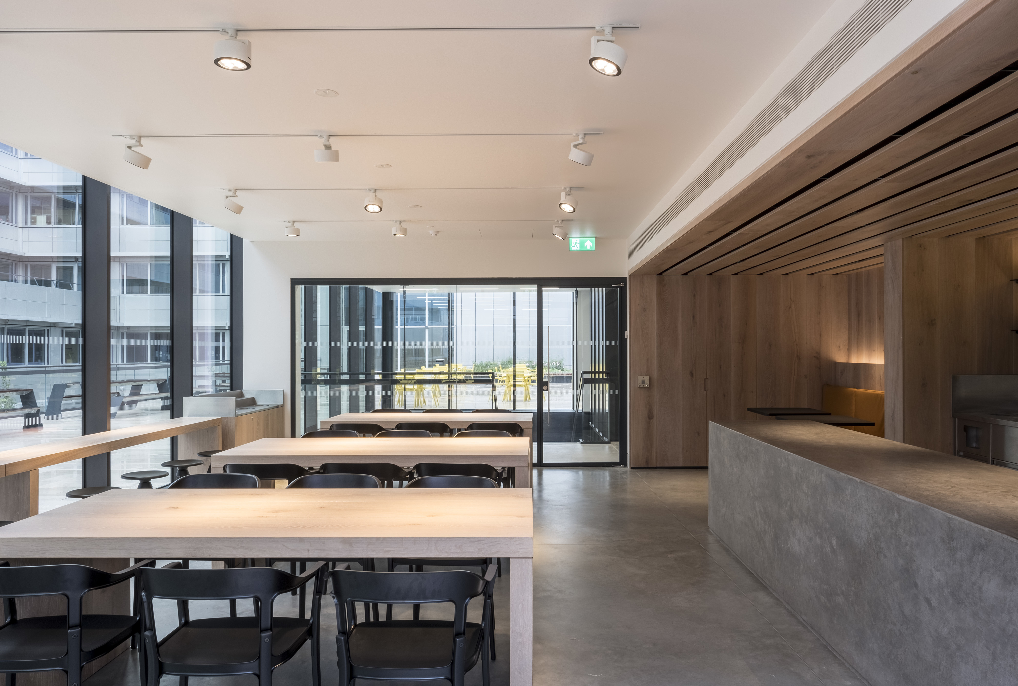 At ground level, heavy cladding was sliced away and nine new retail units clad in dark aluminium were inserted, animating the streetscape. There is now an expansive reception space with full-glazed elevations, a new cafe pavilion serving a generous terrace, and secure cycle parking at basement level with associated shower facilities.